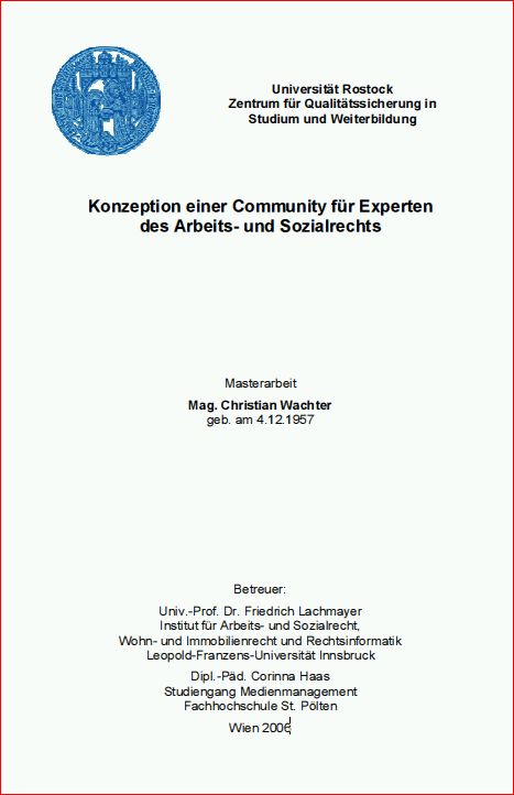 Wachter, Christian, Konzeption einer Community für Experten des Arbeits- und Sozialrechts, Wien, Universität Rostock, 2006. PDF-Download.